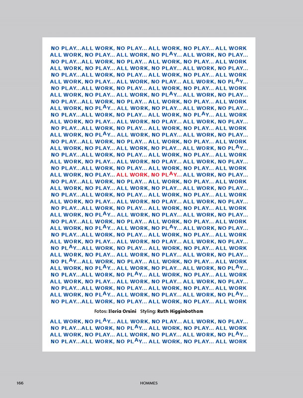 這輯主題名爲“All Work, No Play” 的2014秋冬季造型目錄由資曆頗深的法國高端時尚雜志《L’Officiel》 德國版傾力打造,並由模特兒Fenn Sean 出鏡、攝影師Ilaria Orsini 操刀掌鏡,內容正是圍繞一位白領的日常工作生活而展開的,而不管是擺盆栽、拉開抽屜、搬紙箱,還是喝水、系鞋帶還有無聊時分的冥想,似乎總也逃離不掉索然無味的辦公室。只有工作、沒有玩樂,這樣的狀態在很無奈之余又有一點親切。另外本次出鏡品牌包括Calvin Klein 、 Z Zegna 、 Hackett London 、 FALKE 、 Hermès 、 Louis Vuitton 、 Giorgio Armani 、 LANVIN 、 Prada 、 Jil Sander 、 Ermenegildo Zegna 、 Marni 、 Dior Homme 等,絕對是大牌雲集的豪華陣容。