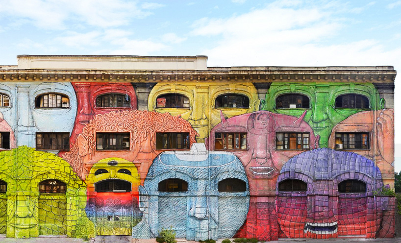 這個巨幅的塗鴉壁畫包含有25個獨特的人物臉孔,同時更是把窗戶作爲了人物們的眼睛,這些形象詭谲、怪誕、惟妙惟肖,同時,不同色彩之間的搭配組合以及漸變風格等更讓畫作突顯出精妙的視覺衝擊效果,不得不敬佩于藝術家天馬行空的創意!