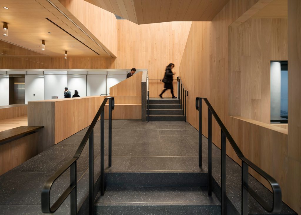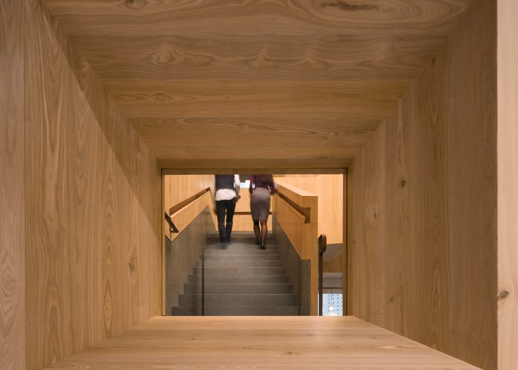 怎樣通過改造樓梯來促進並鼓勵員工之間的交流?近日,建築工作室Neri&Hu 操刀設計了Bloomberg 位於香港的辦公室,主要通過對一個原本就有的標志性螺旋式旋轉樓梯的改造,爲員工們提供了更爲廣闊的互動空間。Neri&Hu 設計了一個四四方方看起來像是一個木盒子般的空間,以樓梯、通道、出入口、窗戶,將三層空間聯系在了一起,而樓梯,在這裏也稱作“Stair of Encounters” ,作爲唯一的縱向空間,毫無疑問擁有著最核心的作用。同時,建築師也在這個木結構中打造了諸多層次感設計,很多木牆因此打通而作爲了大小不一的“框”,這麽做正是爲了促成員工之間的“偶遇”繼而發生更多交流。