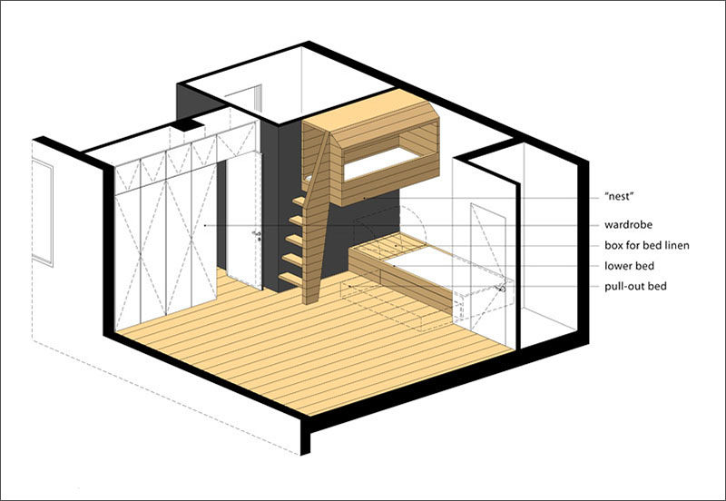 小朋友的臥室怎麽設計會顯得更有趣呢?建築工作室PROJECT905 近日受到一戶擁有三個孩子的家庭委托,被要求在莫斯科設計一個全新的家庭公寓。在執行的過程中,PROJECT905 決定,在孩子的臥室中建造一個“Nest’” ,以便他們能愉快玩耍。這個有趣的鳥巢狀小窩是一個高架的木盒,由原木材質精心打造,不僅能俯瞰臥室的其余部分,同時也是專屬於孩子的一個甯靜隱蔽的玩樂之地。孩子只需沿著黑板牆邊的梯子,就能爬上小巢,在裏面,還配備有舒適的墊子。即便是專門設計給孩子,如此精巧的設施就連大人也想上去看一看呢。