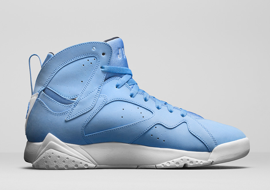 Air Jordan 7 北卡藍版本,通體透徹清新藍色設計,鞋底的純白色與鞋上的標識呼應,乾淨簡潔。有一部分樣品鞋預計今年夏天會到各個零售店,但也有傳言說4月29日就可以買到這雙充滿清新風格的新款球鞋。