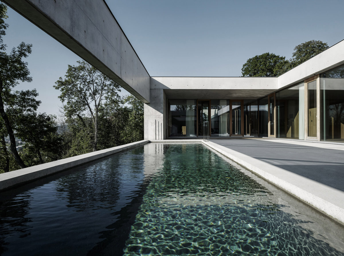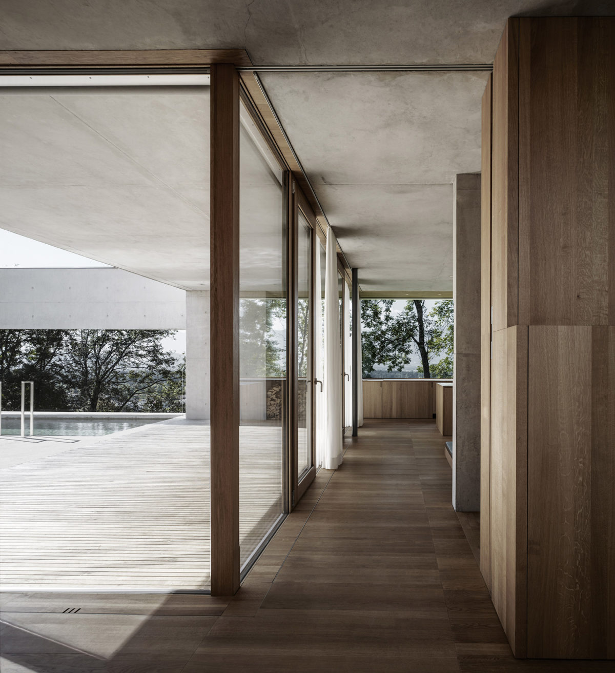 框景之間,容納的是服貼於清水模表面的落地窗,水平地向兩側延展開來,而其中一處框景所擁抱著的一方泳池及池畔的休憩空間,更直直地凝視著遠方山稜,讓居住在 House of Yards 中的人們能輕鬆將歐陸最平緩慷慨的山景盡收眼底。