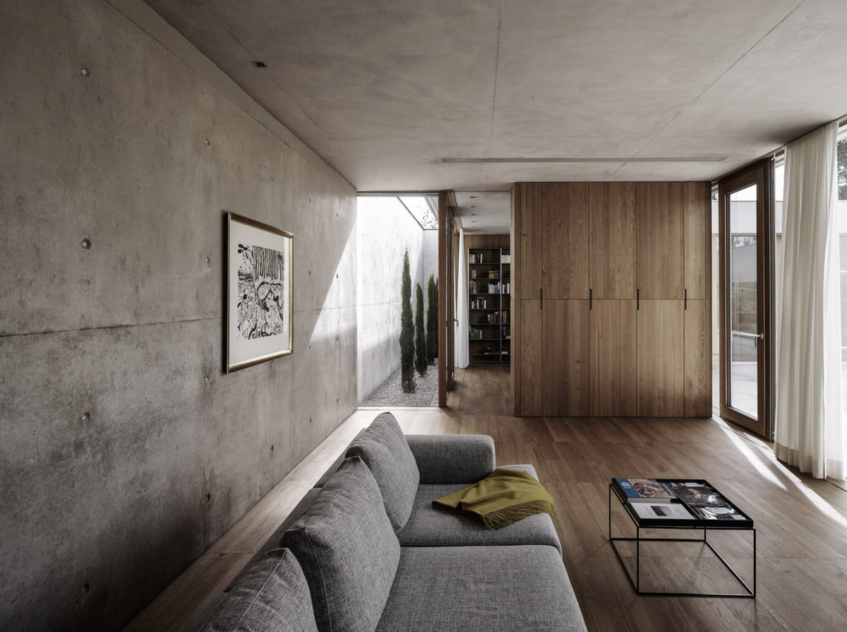 除了埋藏在沈穩外觀之中的多樣設計巧思以外,House of Yards 內部寬敞的空間規劃中,實用及美感之舞也不遑多讓。與外觀硬派的水泥及俐落的線條成為互補地,Marte.Marte 在室內設計大量採用色澤自然的實木板,於地面及牆面深淺交錯地並列出純樸的氛圍,並將無彩色的家飾品及藝術品點綴其間,讓建物切割引進空間的日光顯得更加溫暖。