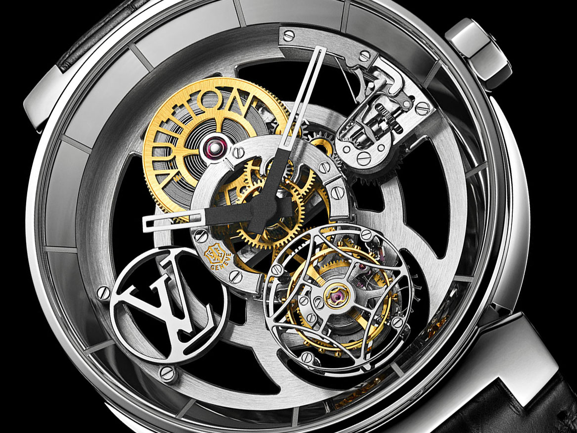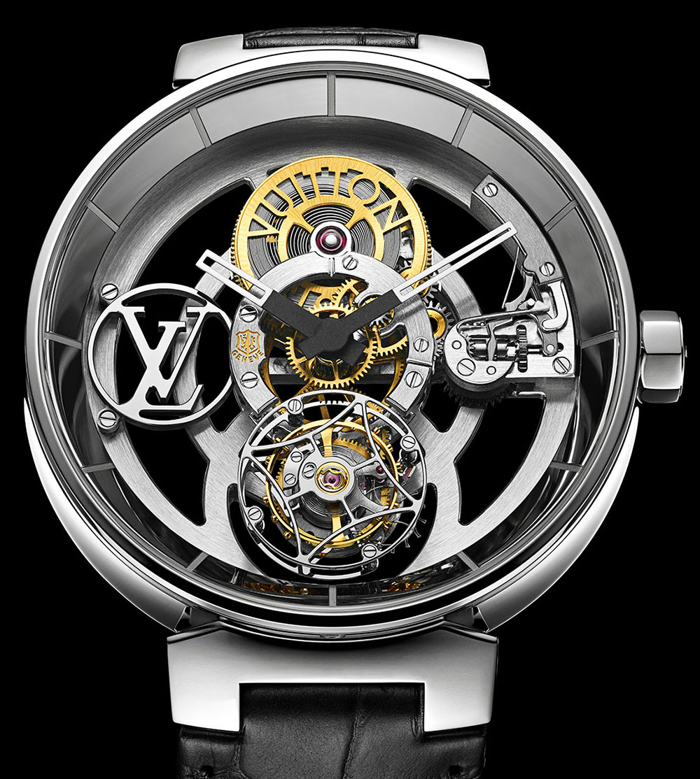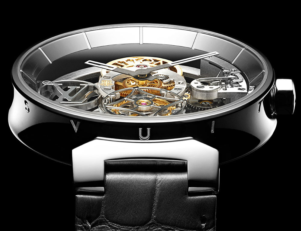 Louis Vuitton 的Tambour 系列一向都有著讓人驚艷的設計,但這款新作卻更加讓人叫絕。採用了白金材質,42.5 mm錶盤,全透明的機械內部結構,還能成事50 m深的水壓,在錶盤內除了堪稱藝術品的齒輪咬合構造,你還能看到LV 的標誌。 配戴3小時可以儲存80 小時的運行時間,絕對不是徒有其表,而是精工製作精準運作的腕上藝術品。